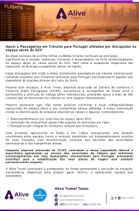 Entre as soluções disponibilizadas pela Alive Travel destacam-se o reencaminhamento de voos através de rotas alternativas fora das áreas afetadas, a utilização de companhias aéreas não sujeitas às restrições em vigor e a reorganização integral dos itinerários de viagem sempre que necessário, garantindo a continuidade das deslocações com elevados padrões de segurança e eficiência.
